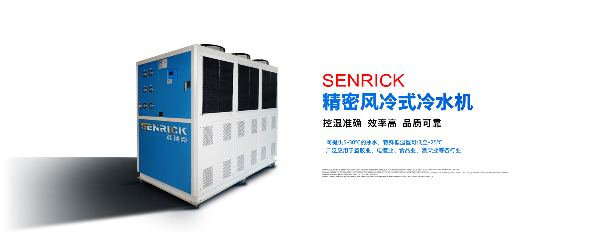 森瑞克機(jī)械(蘇州)有限公司(簡稱:SENRICK)是一家中外合作性企業(yè),引進(jìn)技術(shù),專注于工業(yè)制冷設(shè)備,工業(yè)溫控設(shè)備,非標(biāo)制冷設(shè)備,集激光,化工,真空設(shè)備輔機(jī)等集研發(fā)、生產(chǎn)、銷售、服務(wù)于一體的的現(xiàn)代化科技企業(yè)。公司擁有完善的制造設(shè)備,先進(jìn)的檢測系統(tǒng),獨(dú)立的加工、生產(chǎn)工藝,一支開拓創(chuàng)新專業(yè)有素的技術(shù)人才團(tuán)隊(duì),以及全面的質(zhì)量控制體系,為產(chǎn)品質(zhì)量的不斷優(yōu)化提供了強(qiáng)大的保障,以確保滿足不同市場的各種需求。經(jīng)過多年的努力企業(yè)相繼研發(fā)生產(chǎn)出了工業(yè)冷水機(jī),工業(yè)冷風(fēng)機(jī),工業(yè)冷油機(jī),工業(yè)機(jī),低溫冷水機(jī),低溫冷風(fēng)機(jī),低溫冷油機(jī),螺桿式冷水機(jī)...